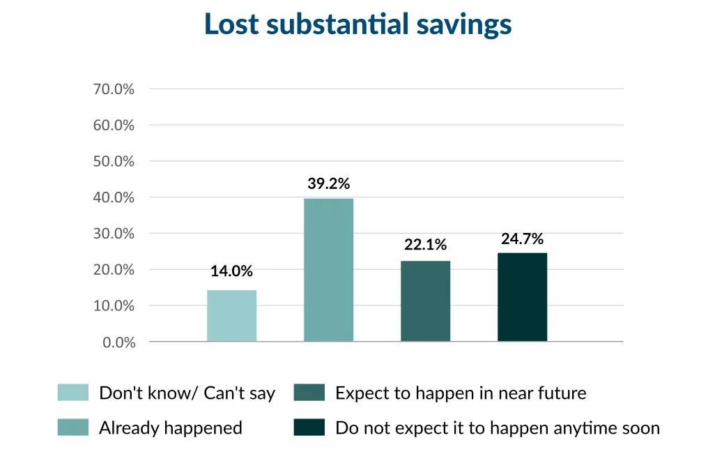 39.2% of Indians have already reported having lost substantial savings, which would roughly translate to 53 crore people and an additional 30 crore who expect this could happen in the near future. Overall, roughly 83 crore people have already experienced or expect to experience a substantial loss in their savings.