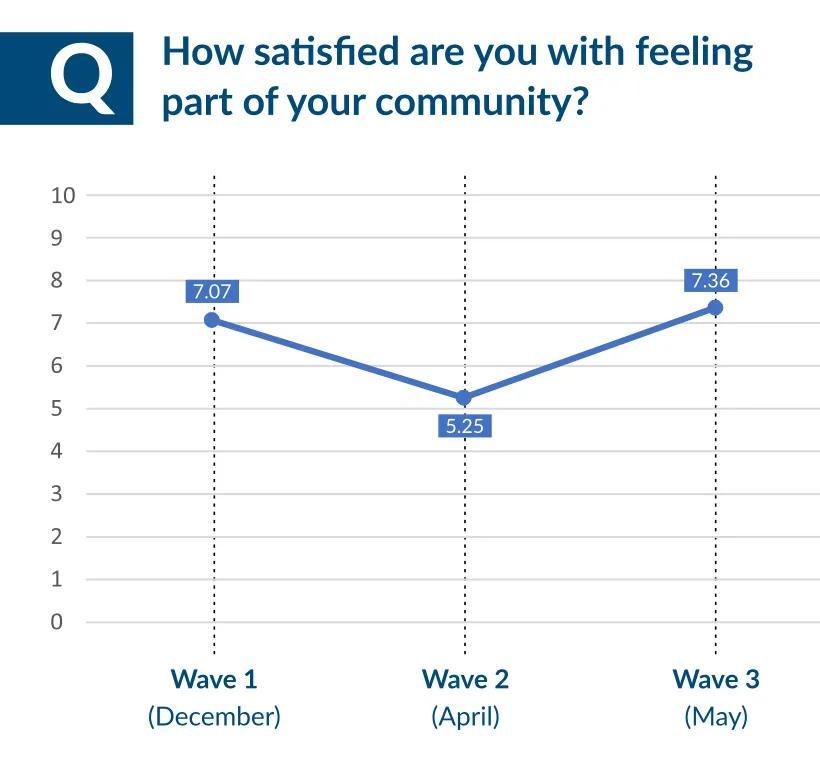 It is also interesting to note that while respondents living in rural (8.14 points, increase of 1.32 points) and semi-urban areas (7.47, increase of 0.23 points ) have reported higher satisfaction with feeling a part of their community during the Coronavirus crisis in May, those living in urban areas have reported a slight decline in the same (7.0 points, decline of 0.17).