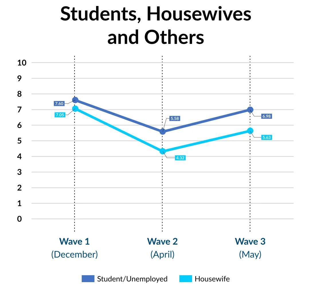 Similar to employees in the private sector, business owners, and farmers, Indian housewives report a very sharp decline of 2.7 points from December to April, perhaps due to overall impact on household income due to the lockdown and overall panic about the spread of the virus. Students/Unemployed reported the least decline when compared to other groups of roughly 2 points from December to April. Overall, their levels of satisfaction in May have also increased to 6.98 (difference of 0.62 points pre-Coronavirus).