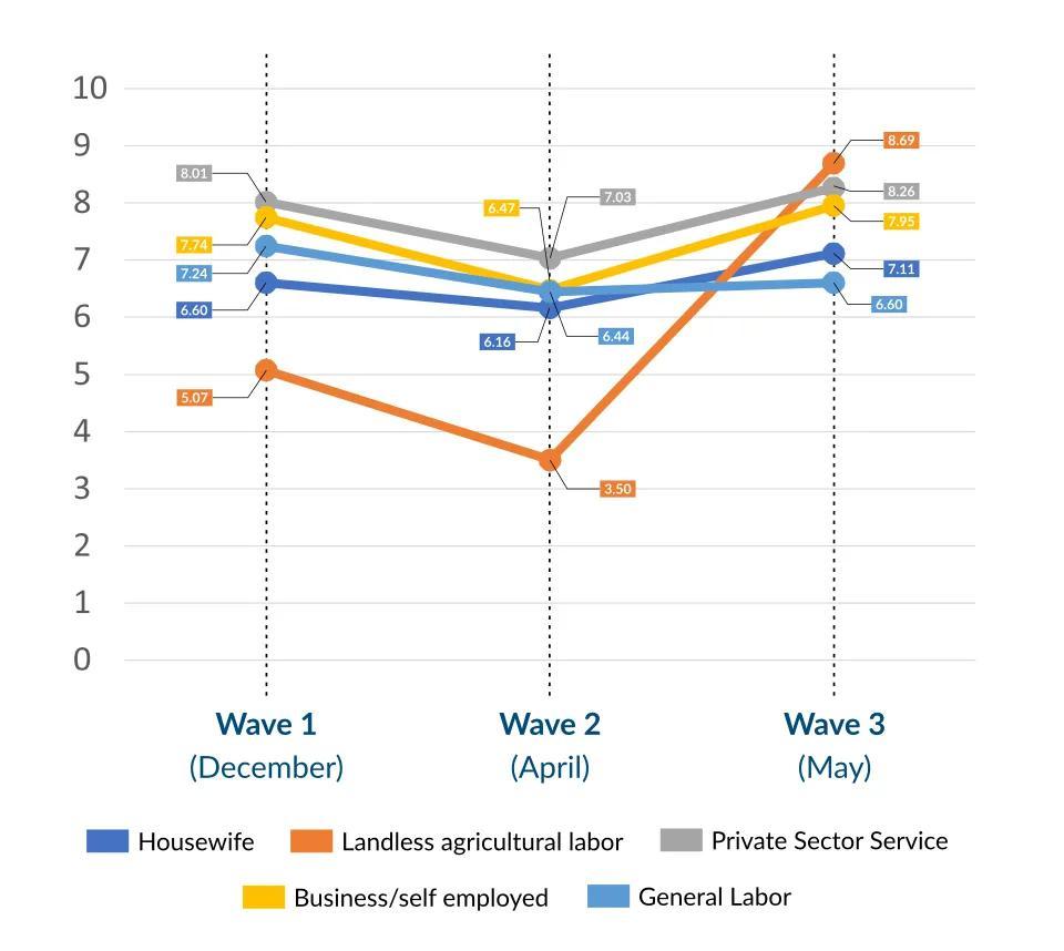 Amongst all the occupation groups, land-owning farmers (8.09), government employees (7.44) and private sector employees (7.56) reported some of the highest levels of satisfaction with their safety, while landless agricultural labour (4.09) and general labour (5.63) reported the lowest. In the third wave of the survey, general labour (7.77) and landless agricultural labourers (8.67) reported a huge surge in levels of satisfaction about their safety. Their satisfaction levels in May were significantly higher than before the Coronavirus crisis in December 2019.