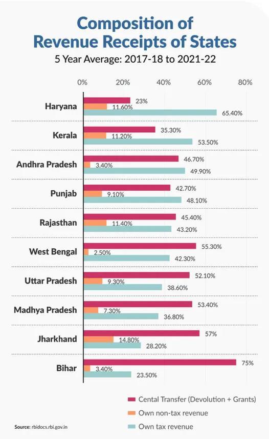 States including Punjab, Rajasthan, Kerala, West Bengal, Bihar, Andhra Pradesh, Jharkhand, Madhya Pradesh, Uttar Pradesh, and Haryana were recorded as having the highest debt burden and account for half of the total expenditure by all the state governments in India. For these ten states, the ratio of their Gross Fiscal Deficit to GSDP is also equal to or more than 3.0 per cent in 2021–22, with Punjab being at the top at 9.60 per cent, followed by Andhra Pradesh at 6.1 per cent, West Bengal at 6.0 per cent, Haryana at 5.3 per cent, and Kerala at 5.1 per cent.