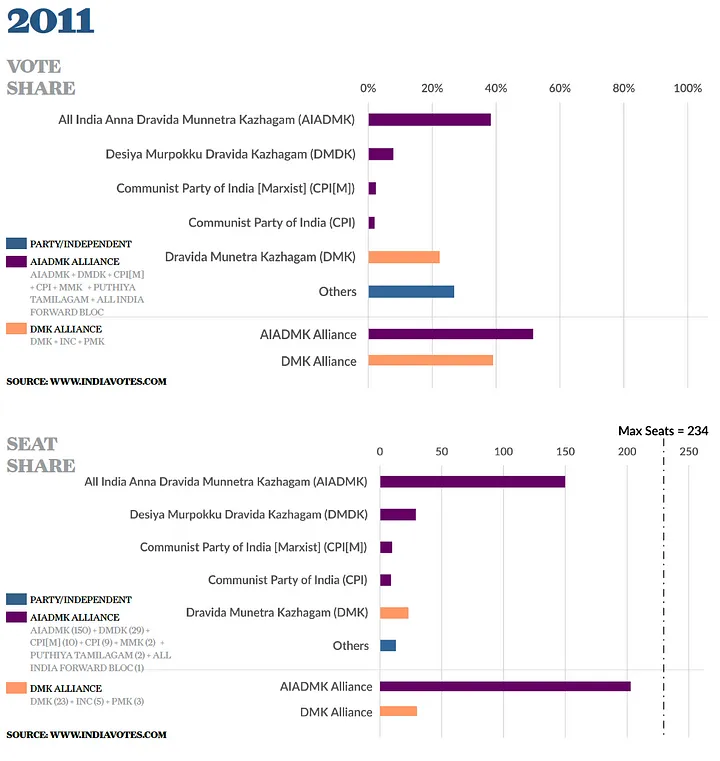 In the 2016 assembly elections, the AIADMK was elected to power for a second time, with a slightly reduced majority, winning 134 seats out of the 235. The AIADMK led alliance managed to secure 41% of the votes, while the DMK led alliance secured roughly 40% of the votes and 90 seats. The AIADMK repeated its record of being the only party to be re-elected in the state. In the upcoming elections, parties are leaving no stone unturned to appease voters. While incumbent Chief Minister Edappadi K. Palaniswami has promised concrete houses to voters, M.K. Stalin has promised to waive all farm and jewel loans. On the other hand, Kamal Hassan, in an attempt to attract women voters has promised to pay a salary to housewives.