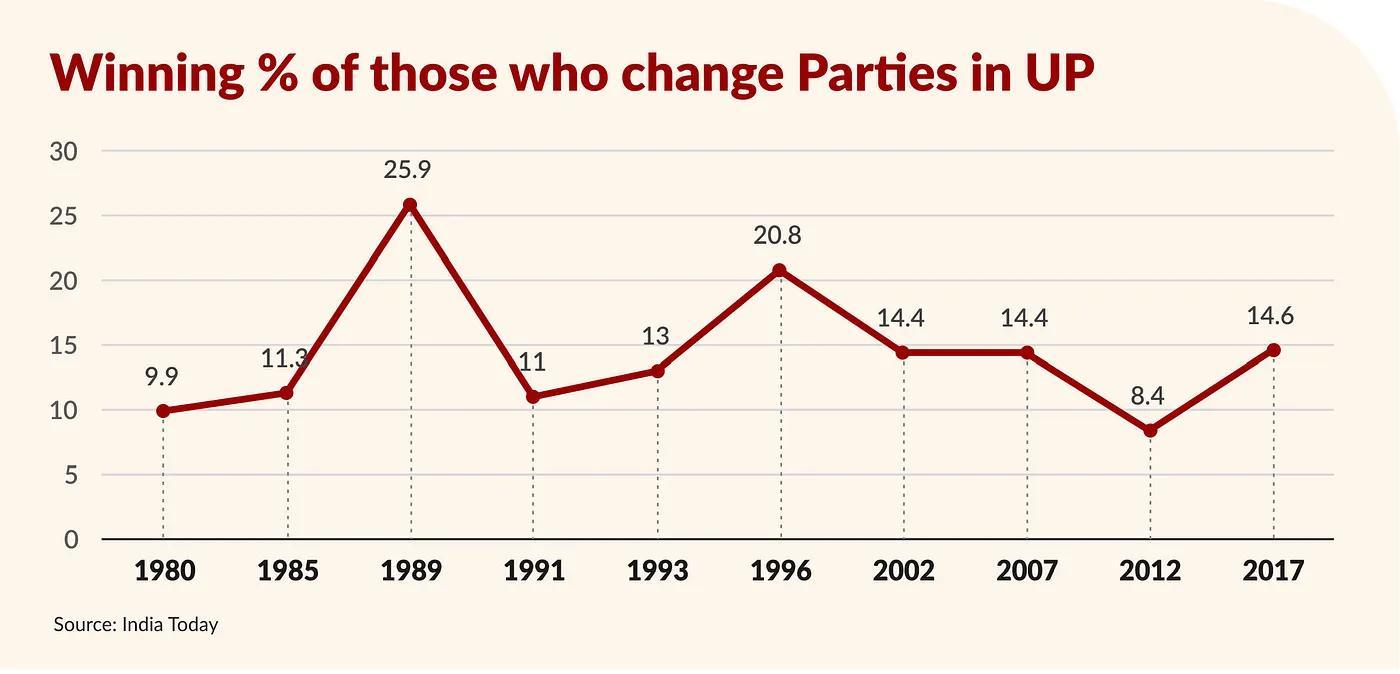 India Today’s Data Intelligence Unit (DIU) analysed numbers of all assembly elections in UP since 1980. The data showcases that barring a few exceptions, first-time candidates occupy around 70 per cent or more seats in all assemblies in the last four decades. This was the highest in 2017 at 78 per cent. In the past few elections, the performance of turncoats in the Assembly has revealed some interesting trends. As per industry analysts, the success rate of turncoats who sided with the winning party is very high. For instance, in UP, the success rate of those who switched to the BSP ahead of the 2007 elections was 100 per cent. Similarly, the success rate of defectors who contested as SP candidates in 2012 was 68 per cent, and on BJP tickets in 2017 a whopping 84 per cent. However, defectors who switch to any party which doesn’t emerge as the ruling party have not performed well in the past. As the average of the last 10 assembly elections shows, less than 15 per cent of turncoats have re-entered the assembly. While defections from a party could at times signal a deeper erosion of support for the party, it is not, however, a tell-all sign as defections could be rooted in the personal motives of candidates to be able to recontest.