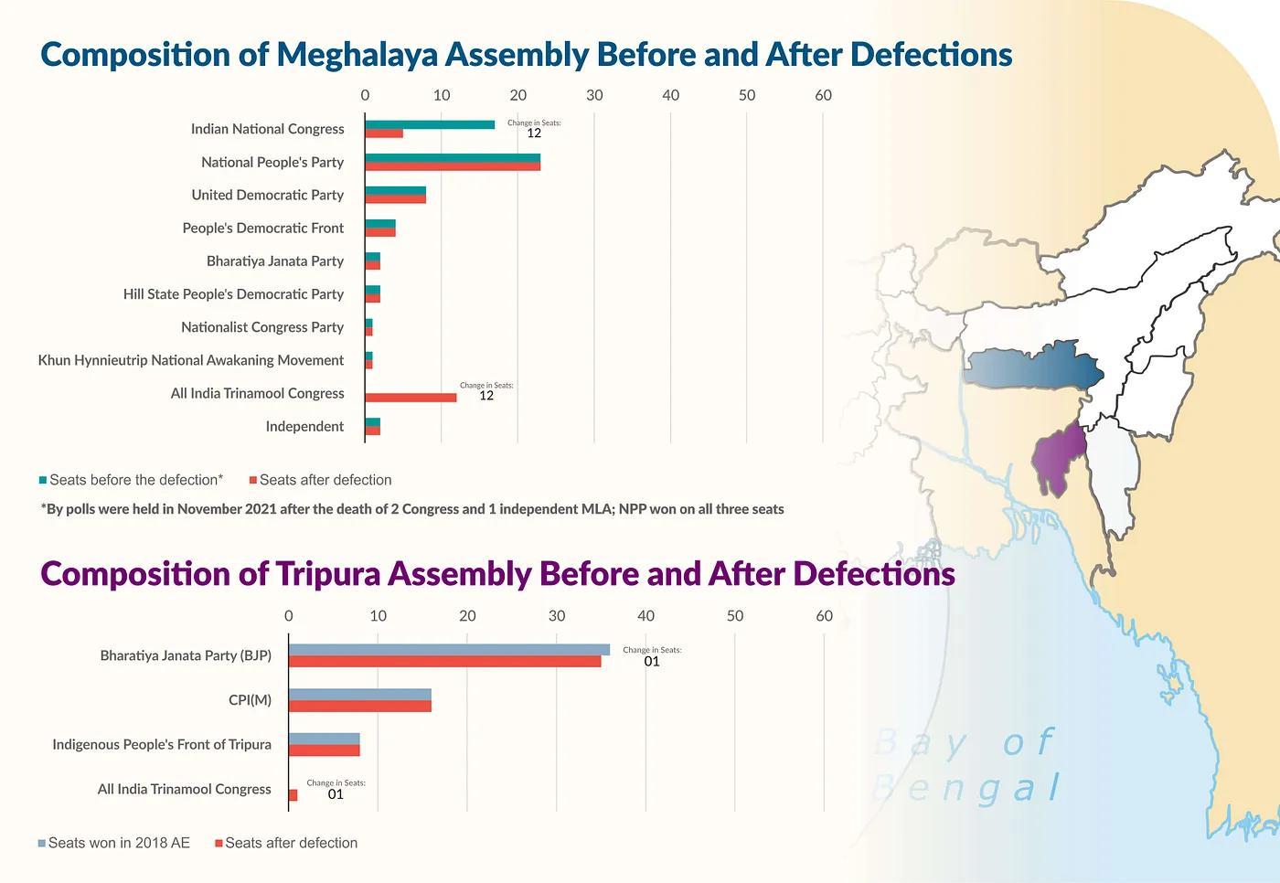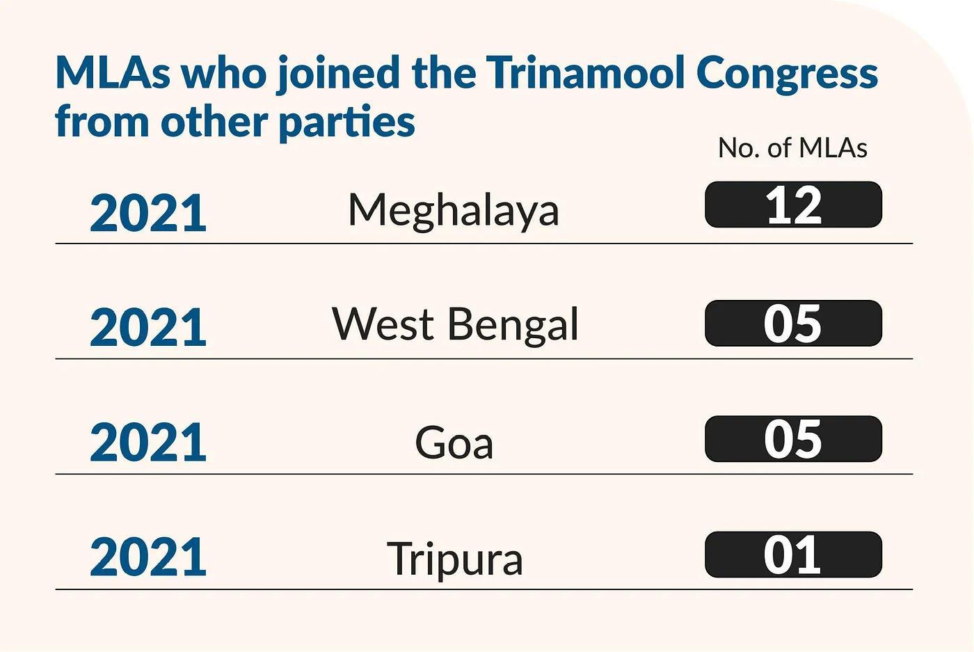 In Meghalaya, the TMC, which earlier had virtually no presence became the state’s largest opposition party in the 60-member House as former Congress chief minister Mukul Sangma and 11 other MLAs formally joined the TMC in November this year. Similarly, in Assam, Sushmita Dev crossed over from the Congress ranks into the TMC fold in August 2021.