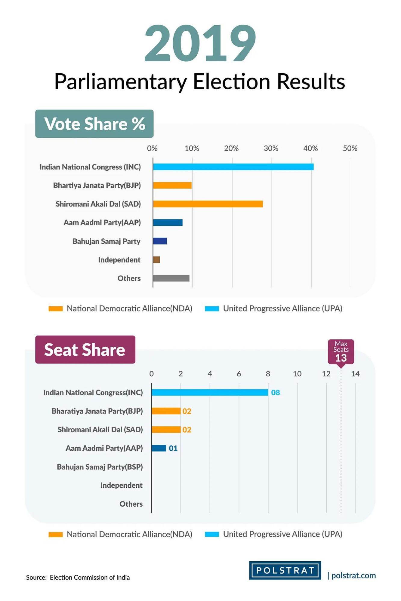 Akali Dal’s vote share dropped sharply from 34.7% in 2012 to 25.2% in 2017. The BJP also saw a shrink in its vote base from 7.2% to 5.4% in the same period. As per the data from the Center for Study of Developing Societies (CSDS), the Congress banked on this by achieving maximum support from the upper castes as well as Dalits. In 2019 as well, the SAD-BJP alliance was able to secure only 4 of 13 seats while the Congress improved its tally from 3 in 2014 to 8 in 2019. Four years after the 2017 elections, the SAD has entered into an alliance with the BSP in a bid to recover the lost space by seeking to gain the state’s one-third Dalit vote.